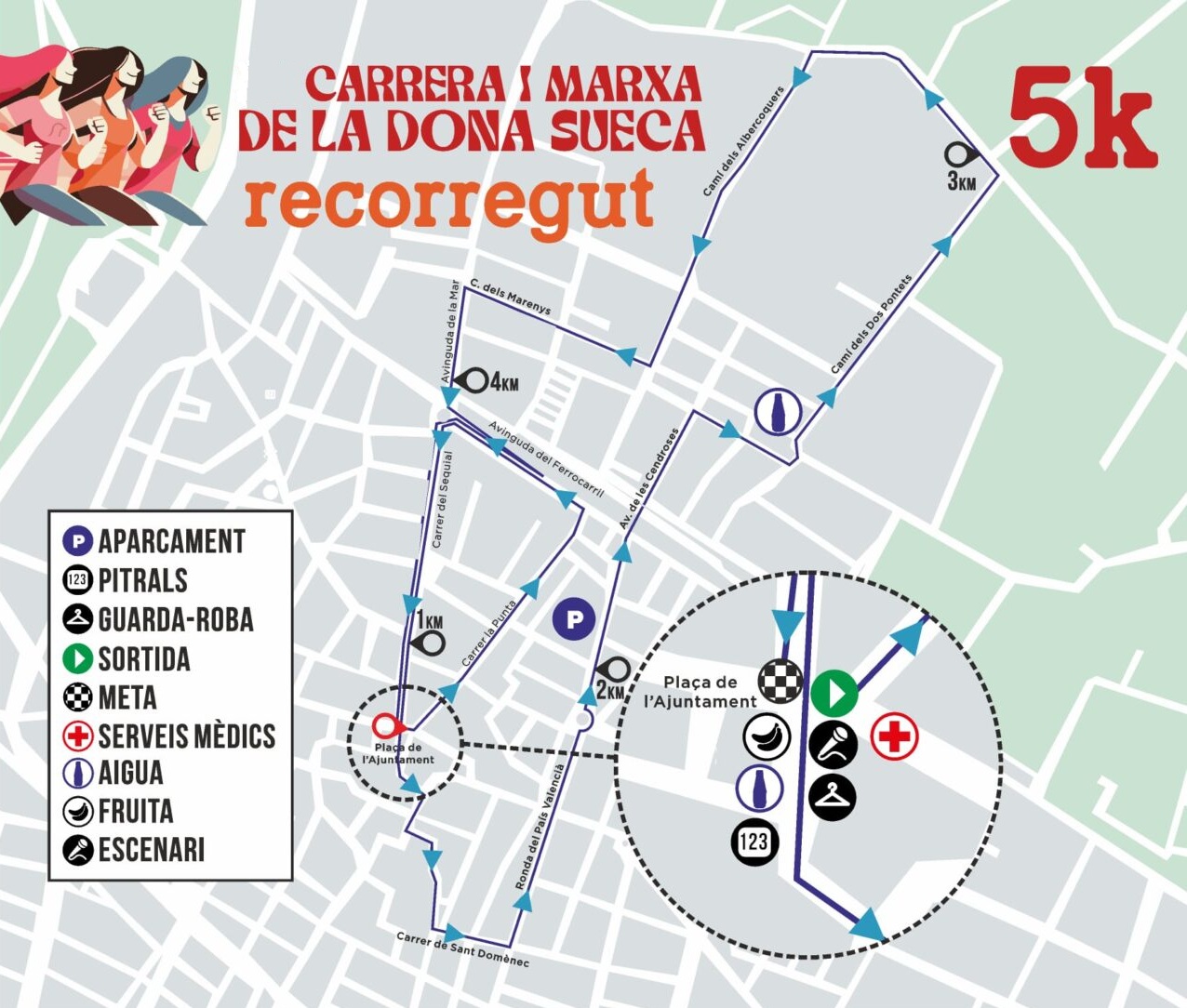 En aquesta edició el recorregut tindrà 5 quilòmetres, gairebé tots urbans i hem traslladat la eixida i meta al centre de Sueca, perquè totes les participants gaudeixin de la festa, actuacions i ambient, que estan programats paral·lelament a la cursa!